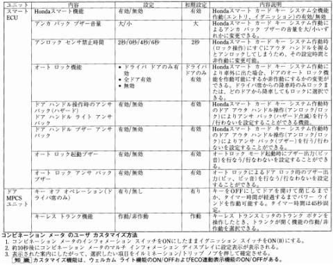 カスタマイズしてみよう!DIYはなかなかできないけれど、改造も必要なく個人でカスタマイズしたり、 又は、ディーラにちょっとお願いすることで簡単にインスパイアの機能をカスタマイズできる 項目がいくつもあります。 これらの多くは取り扱い説明書にも書いてありませんが、実際には色々と変更できるもので なかなか便利なものもありますのでご紹介したいと思います。 ■ユーザカスタマイズ機能 (下の表をクリックするとPDFファイルが表示されます)